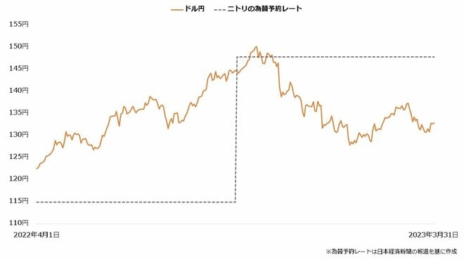 ニトリは円安に備え2022年9月分までは1ドル=114.90円で為替予約していたものの、10月以降の予約レートは147.80円でした。このため、下半期では為替取引に伴って損失が生じたとみられています。