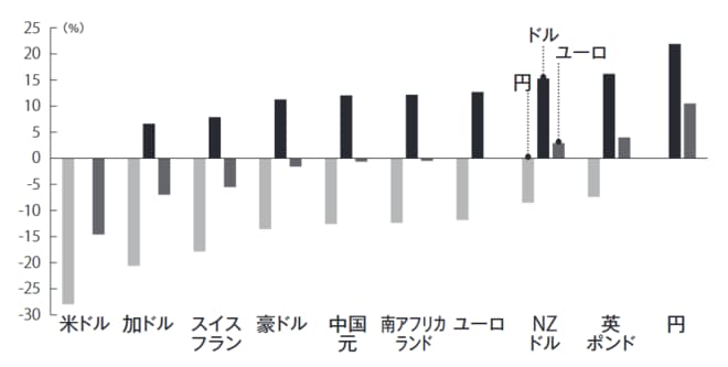 その意味で、先述した「円安」という報道は正しいです。一方、同じくドルの年初来騰落率を見てみると、ドルはすべての主要通貨に対して上昇していました。したがって、この年は「円が最弱だった」だけでなく、「ドルが最強だった」ことが、約38円50銭ものドル高・円安につながったことがわかります。