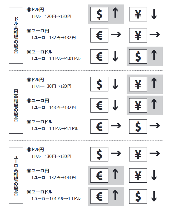 このように見ると、この期間に起こったことは、ドル高相場であったということがわかります。3つの通貨ペアが、「ドル高」「円安」「ユーロ安」「ドル高」となるときの相互の動きは図表1-3のようになります。