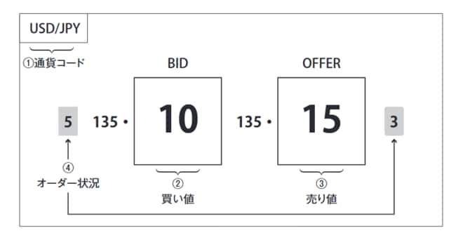 気配値とは、ビッドとオファー、つまり買い方と売り方が希望する値段(オーダー・注文・指値)のこと。プライスを読むときは、時間がかかるので大台は省いて、小数点以下の部分だけ伝えるのが一般的。