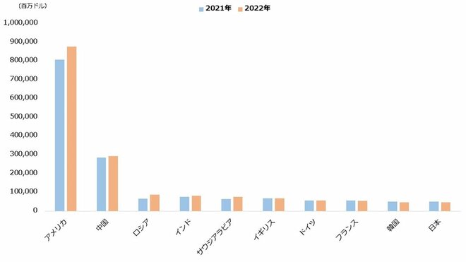米中対立は防衛費の増大にも拍車をかけています。ロシア・ウクライナ問題もあり、2022年に世界の軍事費は3.7%増加しました。アメリカでは700億ドル以上の増加となっており、軍事関連企業には恩恵が期待されています(出所:ストックホルム国際平和研究所 軍事支出データベース)。