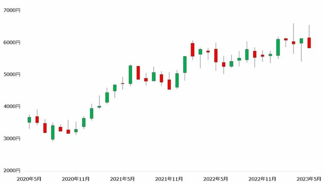 【セブン&アイ・ホールディングスの株価(月足、2020年5月~2023年5月】