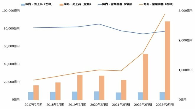 これを機にセブン&アイの海外事業は大きく前進し、現在では全世界に8万5000店舗を構える世界的な小売りグループとなっています(2023年2月末時点)。特に海外コンビニエンスストア事業の発展が目覚ましく、2023年3月期にはセグメント売上高が8兆円を突破しました。営業利益でも国内を初めて上回っており、セブン&アイの収益源が海外に移っている様子がうかがえます。