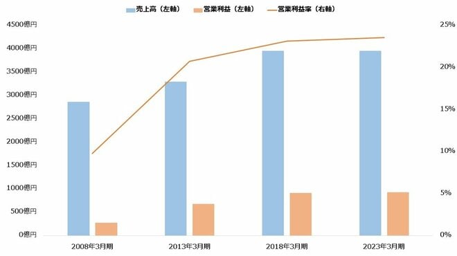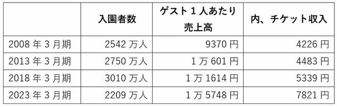 チケットの値上げは業績に寄与しているようです。1人あたり売上高は2008年3月期の約1.7倍にまで増加しており、テーマパーク事業の営業利益率は23%台に達しました。