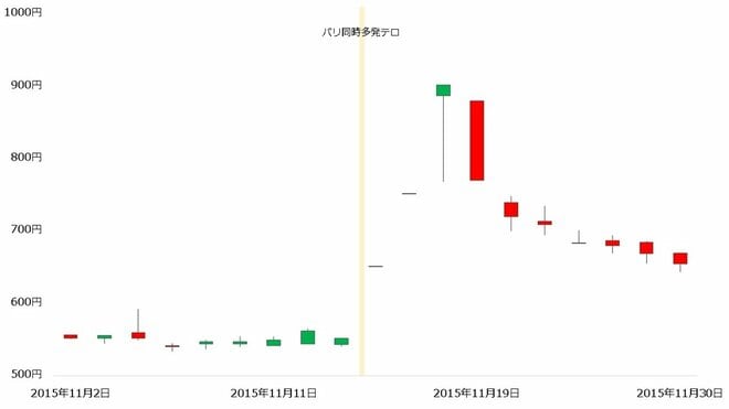 テロが起こると、防犯や警備を手掛ける企業の株式が動意することが少なくありません。例えば2015年11月の「パリ同時多発テロ」では、警備会社のアール・エス・シーが大幅高を演じました。