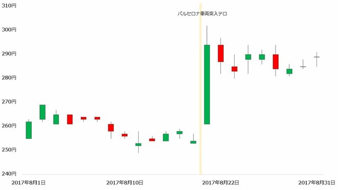 また2017年8月にスペインのバルセロナで車両を使ったテロが発生したときは、子会社がボラード(テロ対策用車止め)大手の英ATG Access社と提携するサノヤスホールディングス株式が急騰しています。
