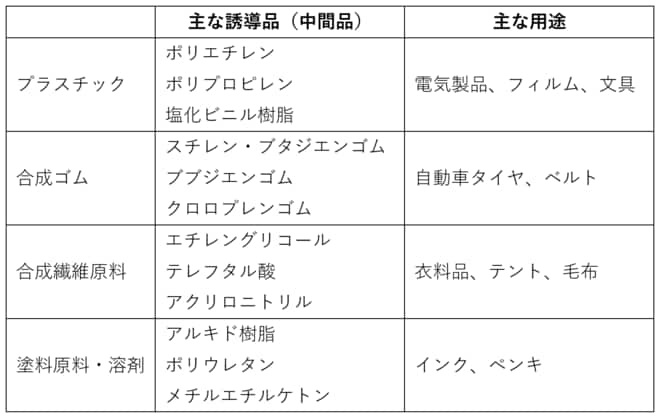 また石油元売り会社は化学メーカーとしての面も持っています。原油は石油ガスやガソリンといった燃料に精製されますが、その過程で生まれる「ナフサ」はさらにエチレンといった基礎的な製品に分解され、誘導品(中間品)を経て多種多様な製品の原料に生まれ変わります。あなたの身の回りにも石油由来の製品がきっと見つかるでしょう。ちなみに出光興産は、エチレンでトップクラスの生産能力を持つ企業です。