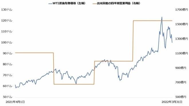 【原油価格と出光興産の四半期営業利益(2022年3月期)】