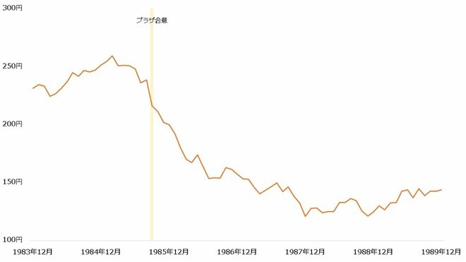 【プラザ合意前後のドル円(月足終値、1983年末~1989年末)】