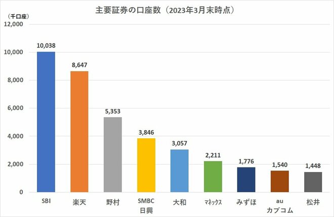 出所:各社決算資料に基づき著者作成。楽天は2022年12月末時点。野村と大和は残高がある口座数