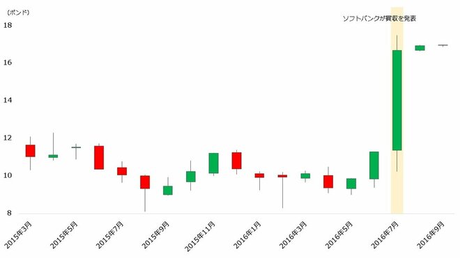 【アームの株価(月足、2015年3月~2016年9月)】