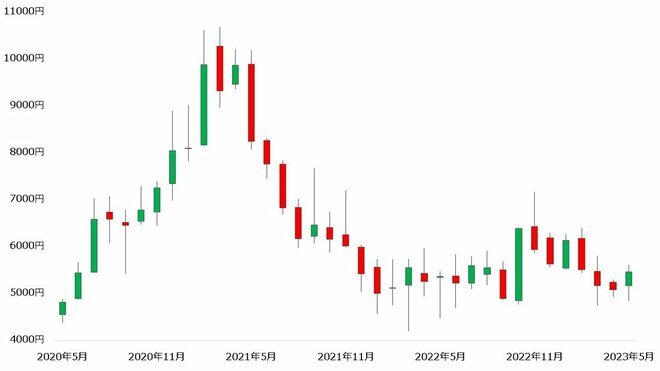 【ソフトバンクグループの株価(月足、2020年5月~2023年5月)】
