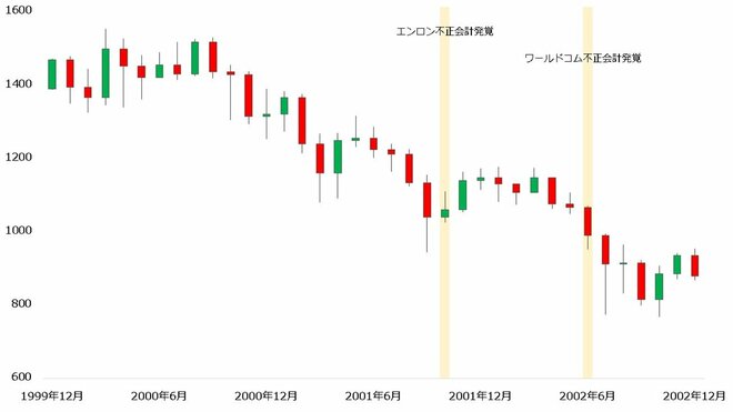 相場の足を引っ張ったのはマクロ要因ばかりではありません。「エンロン」と「ワールドコム」という巨大企業が連鎖的に倒産したことも関係しています。しかも、両社はいずれも粉飾に手を染めたことが明らかになっており、大企業に対する不信感が広がりました。