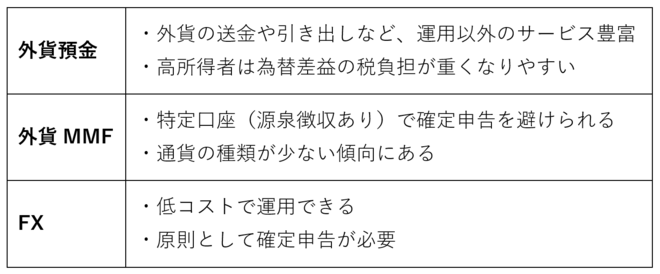 円建てのMMFはマイナス金利の影響を受け全て運用を終了していますが、「外貨MMF」は現在でも取り扱う金融機関があります。「外貨預金」や「FX」のように為替差益が期待できるほか、利子のように金利に由来する収益もあることから、運用の効果は同じようなものとなるでしょう。