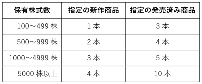 購入できる本数は保有株数が多いほど増えますが、100株でも新作商品1本、発売済み商品3本の計4本を優待価格で買うことができます。