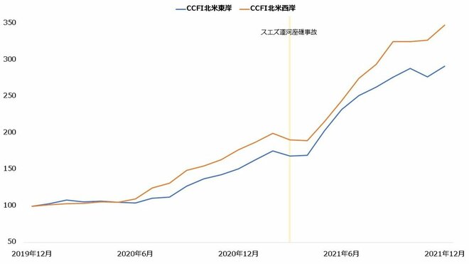 冒頭の座礁事故は、海運市況がコロナショックから回復していた2021年3月に発生しました。運航が再開されるまでは約1週間かかり、400隻以上が足止めされたとみられています。需要が強まる中でスエズ運河が閉ざされたことから、コンテナ船運賃の世界的な高騰を招いたと指摘されています。