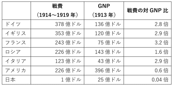 戦争は休戦協定が結ばれた1918年11月までおよそ4年3カ月続きました。戦場となったヨーロッパ各国は特に大きな戦費負担が生じ、多くの参戦国でGNP(国民総生産)の数倍もの費用が発生しました。