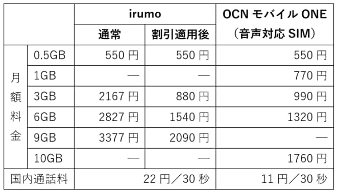 OCNモバイルONEとirumoは、どちらもデータ容量が比較的小さいライトユーザー向けのプランですが、「0.5GB」コースを除き、いずれのデータ容量でもirumoの方が高い料金設定となっています。最大で月1287円が差し引かれる(0.5GBコースを除く)割引を適用させても、OCNモバイルONEの方が低料金でした。