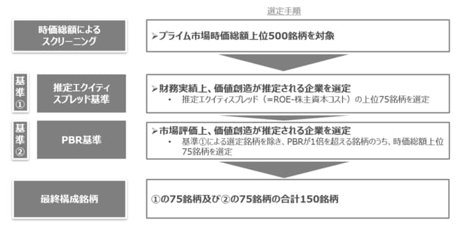 ◇高いガバナンス基準が課されるプライム市場上場会社であって時価総額上位500社から、価値創造が推定される150社を選定