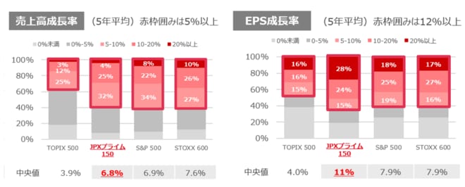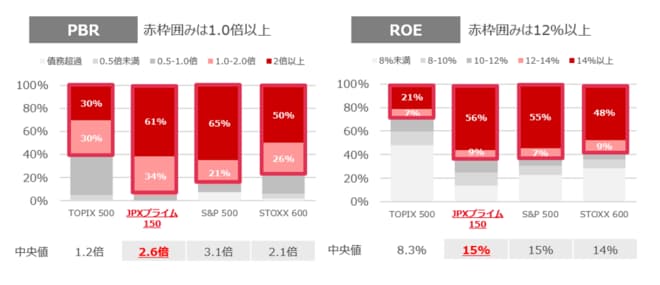 高橋 詳しくはグラフをご覧いただきたいのですが、プライム150の構成銘柄のPBRやROE、売上高と1株当たり当期純利益(EPS)の成長率、時価総額の分布は、米国のS&P500や欧州のSTOXX600といった主要指数に比べても遜色のないグローバルな水準だと思います。