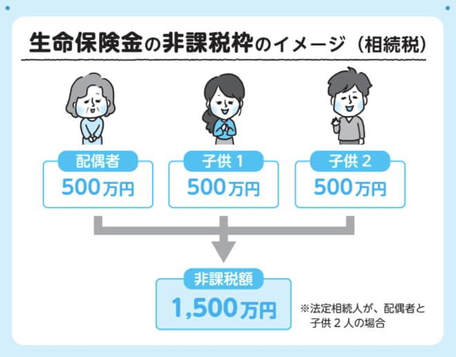相続財産がこれ以上ある場合、相続税対策として生命保険を活用する人もいます。生命保険金の非課税枠を使えるからです。計算式は「500万円×法定相続人の数」。例えば、妻と子供2人の計3人が法定相続人である場合、「500万円 ×3人 =1,500万円」までなら非課税限度額の範囲内なので、保険金には相続税がかからないことになります。