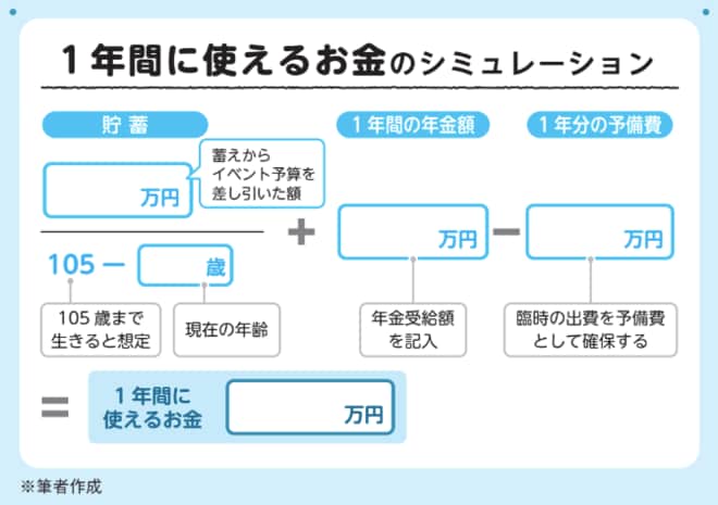 蓄えを取り崩す場合、そこから、これから想定するイベントの費用を引き算した後に、余命で割ってみるといいでしょう。1年間に取り崩せる金額を算出できます。