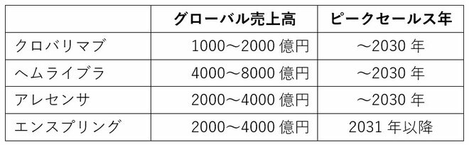 中外製薬で上市間近と目されるのが「クロバリマブ」です。指定難病の一つ「発作性夜間ヘモグロビン尿症」の治療において2023年2月に有効な試験結果を獲得し、同年6月に厚生労働省へ承認申請を行いました。中外製薬はクロバリマブで1000~2000億円のグローバル売上高を見込んでいます。