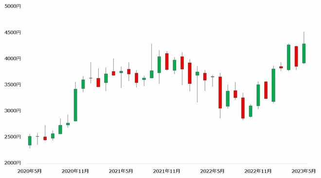 【信越化学工業の株価(月足、2020年5月~2023年5月)】