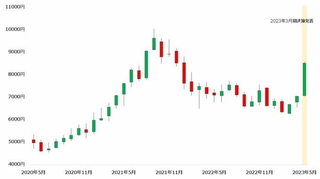 「富士フイルムホールディングス」の株価が反発しています。売上高が大幅に伸び、翌期も増収増益を予想した2023年3月期の決算が好感され、月足は大きな陽線を描きました。2021年9月の上場来高値(1万55円)を更新できるか関心が集まっています