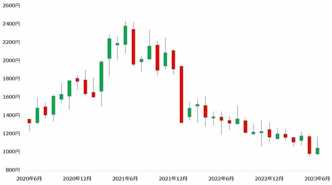 【サイバーエージェントの株価(月足、2020年6月~2023年6月)】