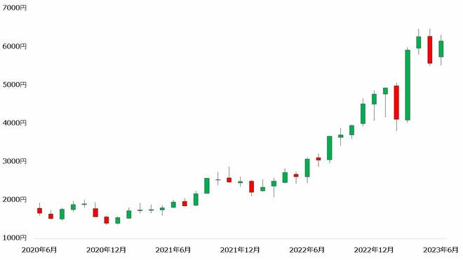 【サンリオの株価(月足、2020年6月~2023年6月)】