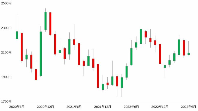 【キリンホールディングスの株価(月足、2020年6月~2023年6月)】