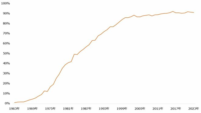 1958年には家庭用クーラーも発売し、ダイキン工業はエアコンなどの空調事業へ軸足を移していきました。ルームエアコンの普及率は1960年から2000年にかけて大きく上昇しており、ダイキン工業の業績に寄与したものと考えられます。