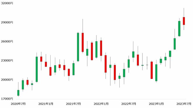 【ダイキン工業の株価(月足、2020年7月~2023年7月)】