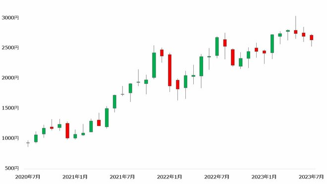 【インターネットイニシアティブの株価(月足、2020年7月~2023年7月)】