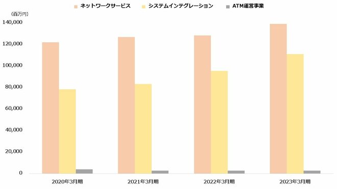 近年はもう1つの収益源である「システムインテグレーション」事業の伸びが顕著です。企業などにシステムの構築や機器の販売といったサービスを行う事業で、売上高はインターネット接続サービスなどの「ネットワークサービス」事業へ迫っています。