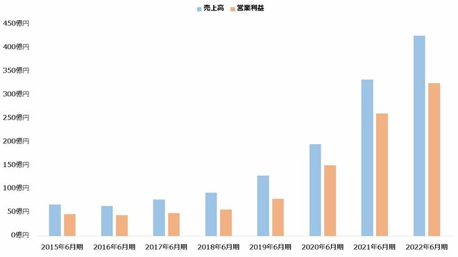 【売上高と営業利益の推移(2015年6月期~2022年6月期)】