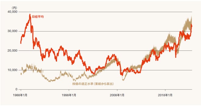 これは1988年1月から直近までの日経平均株価と、それぞれの時点での企業業績から導き出した株価の「適正水準」をプロットしたものです。日経平均は89年12月29日に最高値となる3万8915円をつけ、2008年9月のリーマン・ショック後の2009年3月10日に最安値7054円まで下落しました。その後、上下動を繰り返しながら直近、3万3000円台をつけるところまで上昇しています。ここでは「適正水準」をPER(株価収益率)15倍と置いています。