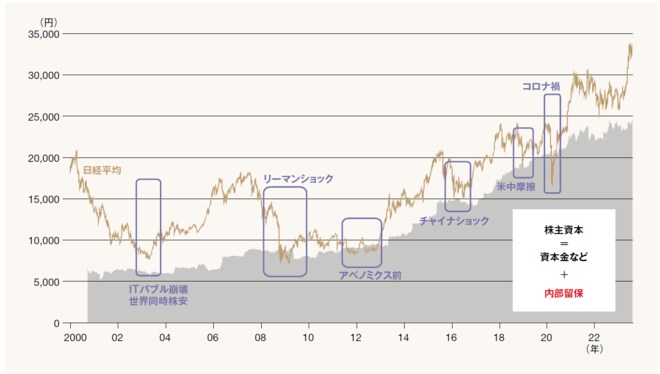 グレーの部分は株主資本、いわゆる“バランスシートの右下”で、折れ線は日経平均株価です。リーマンショックやコロナ禍など例外はありますが、日経平均が下がっていくときはこのグレーの“斜面”までで、ここがPBR1倍の水準です。