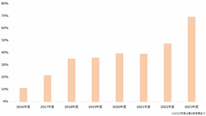 近年では東南アジア向けに配信を開始した『ラグナロクオリジン』がヒットしました。2023年4月にリリースするとタイやフィリピンなどでダウンロード数・売上ともに1位を獲得し、業績に大きく寄与しています。同年第2四半期時点で海外売上高比率は69.6%にまで上昇しました。全体の売上高も直近5年間で最大となっており、好調な様子がうかがえます。