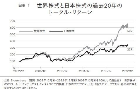それでは実際に、世界に視野を広げて投資をすることでどのような収益が期待できるのかを見てみます。過去20年間のリターンを振り返ってみましょう。図表1は2002年12月末からの20年間について、日本株式のみに投資した場合と、日本を含む世界株式に投資した場合のリターンを比較しています。日本株式のみに投資した場合でも3倍以上のリターンが実現していますが、世界株式は日本株式のみの場合のさらに約1.8倍のリターンとなっています。世界には高い収益力を誇る企業が数多く存在していることがこの結果に影響している要因と考えられます。