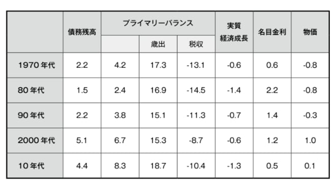 国の債務残高対名目GDP比急増の原因を探るため、1970年度以降の国の債務残高対名目GDP比の変動を、プライマリーバランス要因、実質経済成長要因、名目金利要因、インフレ要因に分解したのが、表1-1である。