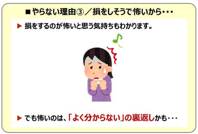 3つ目は「投資は損をしそうで怖いから」です。損をするのが怖いと思う気持ちはわかります。