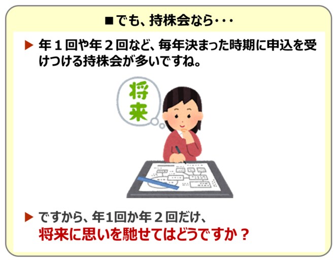 でも、持株会なら、年1回や年2回など、毎年決まった時期が申し込みを受け付けていると思います。