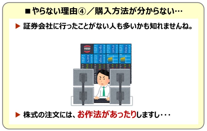 たしかに証券会社に行ったことがない人も多いかも知れません。株式の注文には「成行(なりゆき)」とか「指値(さしね)」とか、お作法があったりしますよね。
