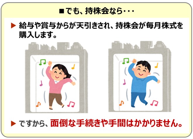 でも、持株会なら、給与天引きで持株会が毎月株式を購入しますので、面倒な手続きや手間は全くかかりませんよね。