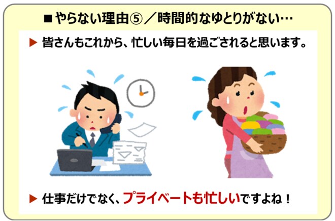 最後の5つ目は「時間的なゆとりがない…」です。これは否定しません。皆さん、公私ともに忙しい毎日を過ごされていると思います。