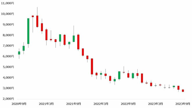 エムスリーの株価が低迷しています。2020年には買いが集まり、2021年1月に1万0675円の高値を付けました。しかしその後は下落傾向にあり、2023年9月末の株価は2716円とおよそ4分の1にまで値下がりしています。