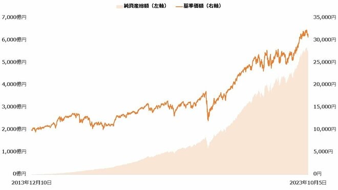 ニッセイ外国株式インデックスは2013年12月に運用を開始しました。同カテゴリーの主要銘柄よりも比較的早くスタートしたことがわかります。先んじて投入したことが投資家のニーズを早くからつかみ、現在の人気につながった可能性があります。