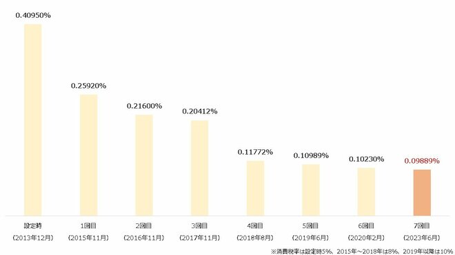 ニッセイ外国株式インデックスの信託報酬はこれまで7度引き下げられました。直近で0.09889%に達し、設定時(0.4095%)の4分の1以下に低下しています。0.1%未満の信託報酬は国内で最低水準です。